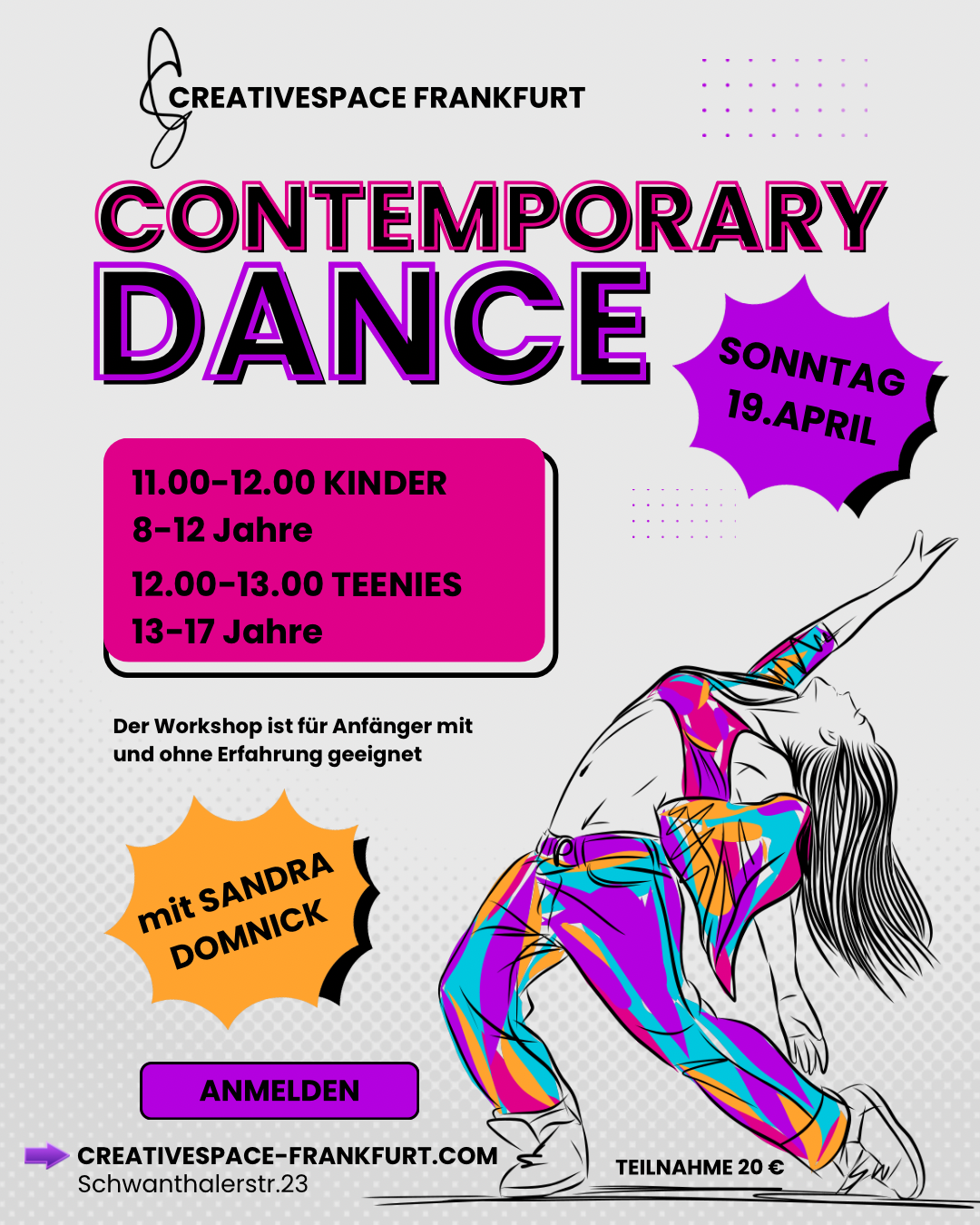 Dieser Workshop verfolgt einen intensiveren und strukturierteren Ansatz. Unter der Anleitung von Sandra erarbeiten die Teilnehmenden technische Übungen, Choreografien und ein Verständnis für Komposition. Elemente wie Bodenarbeit und Partnerarbeit spielen eine zentrale Rolle und fördern Ausdruck, Technik und Zusammenarbeit.